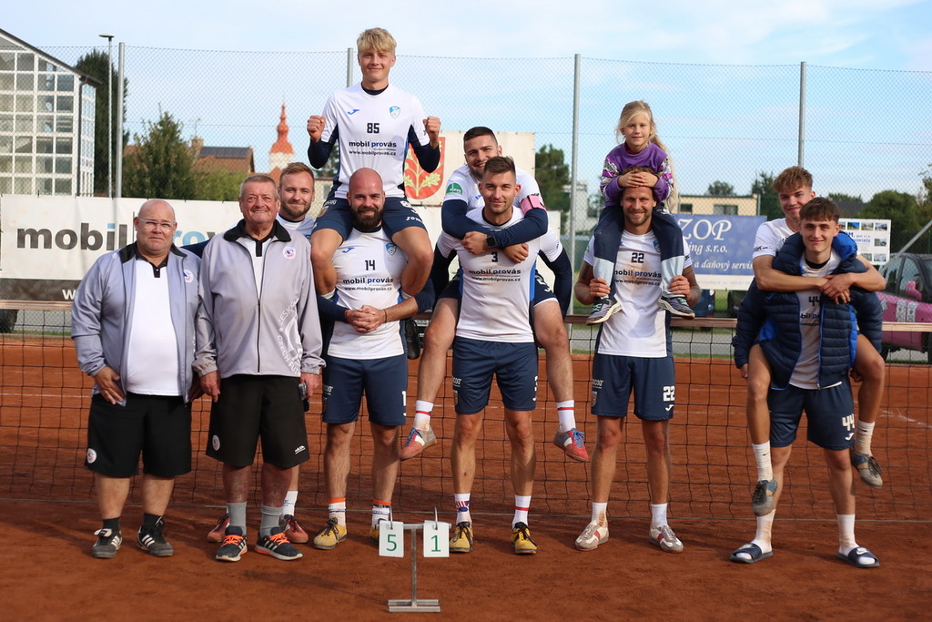Při vedení 4:1 už tedy chyběl jen jeden zápasový bod k výhře v utkání. V následujícím zápase na sebe narazily elitní trojice. U nás Šamalík, Jahoda Gurtler a u soupeře Macura, Jakub Šiška a Lacko. První set ovládli 7:10 hosté. Ti byli lepší i v setu druhém. Vedli již 1:6. Trenér Spousta reagoval střídáním. Na plac šel na nahrávku poprvé mladíček Mrňa. Jahoda se posunul na blok a na útok k Šamalíkovi. Tyto změny se začaly okamžitě blahodárně projevovat na hře naší nové sestavy. Skóre jsme stáhli na 6:7. Pak soupeř ale odskočil na 6:9 a chyběl mu bod k výhře. Naše trojice však ukázala mimořádnou bojovnost a touhu neprohrát. Chci pochválit zejména mladého Tondu Mrňu, který šel „na plac“ zcela nerozehraný a v kritické situaci. Ukázal však výbornou obranu a klid na nahrávce. Další mladík Jahoda pak bodoval i úspěšně blokoval. Set došel do stavu 9:9. A tady se odehrál nejhezčí míč celého utkání. Za devítek byl na útoku Jahoda. Ten zaútočil odvážně a sebevědomě utaženou zatáčkou podél pásky, kterou si navíc ještě exhibičně dokázal „zašlápnout“. Zdánlivě ztracený set jsme tedy dokázali skvěle uhrát a šlo se do třetí zkrácené sady. V ní jsme už „jeli na vítězné vlně“ a po výhře 10:8 ukončili celé utkání skvělou a určitě takto snadno nečekanou výhrou 5:1.